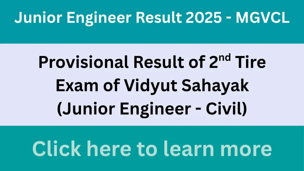 MGVCL Means Madhya Gujarat Electricity Company Limited had issued an advertisement in July 2025 to fill a total of 62 vacancies for Vidyut Sahayak – JE(Civil). For which, MGVCL timely released the exam program and answer key of the first exam conducted as well as the list of eligible candidates for the second exam and also organized the second exam and its result was declared on 13 Nov. 2025. More detailed information about which is given in the article below.